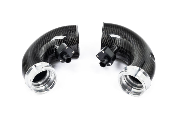 Presenting the perfect addition to our X5M, XM intake system to optimise the flow path all the way to the turbos. Our carbon inlets have a larger volume than the stock inlets by maintaining a larger diameter all the way to the turbos. The stock inlets narrow down immediately after the connection to the intake which creates a restriction especially at higher boost levels. We have alleviated this restriction and also designed the curvature to be as smooth as possible allowing the turbos to function with reduced resistance. Made from prepreg carbon fiber with CNC machined flanges, the inlets also provide an aesthetic improvement to the engine bay.