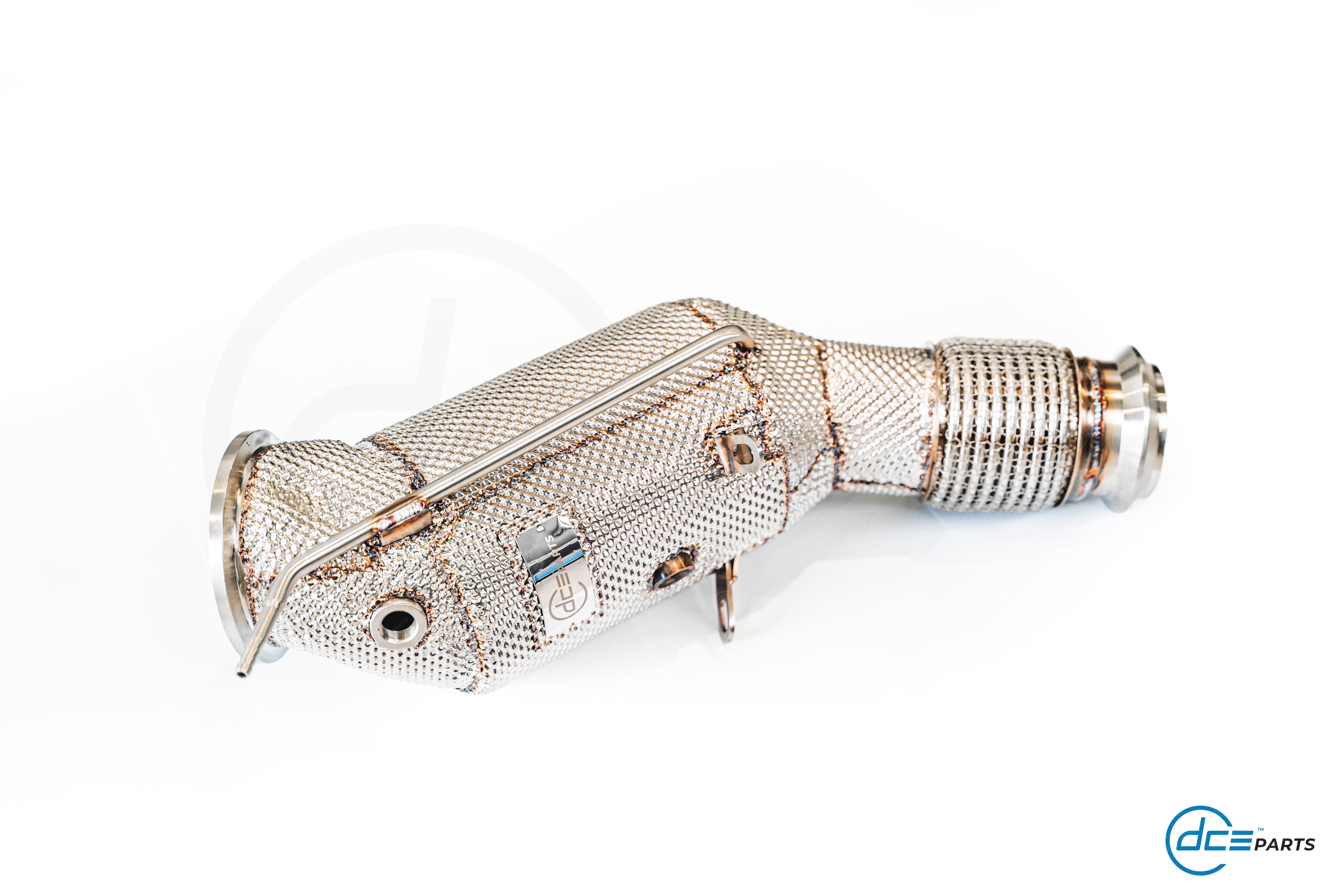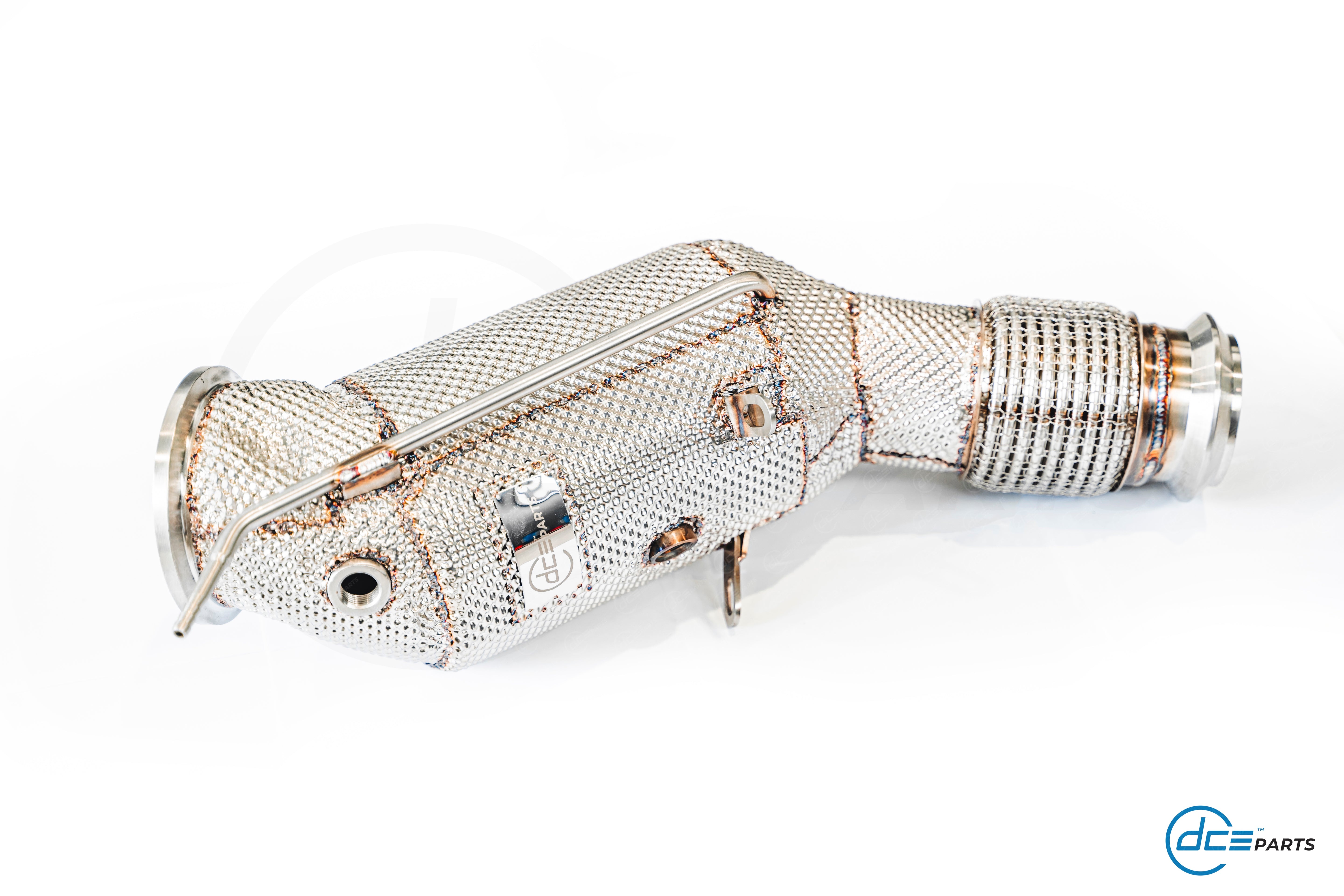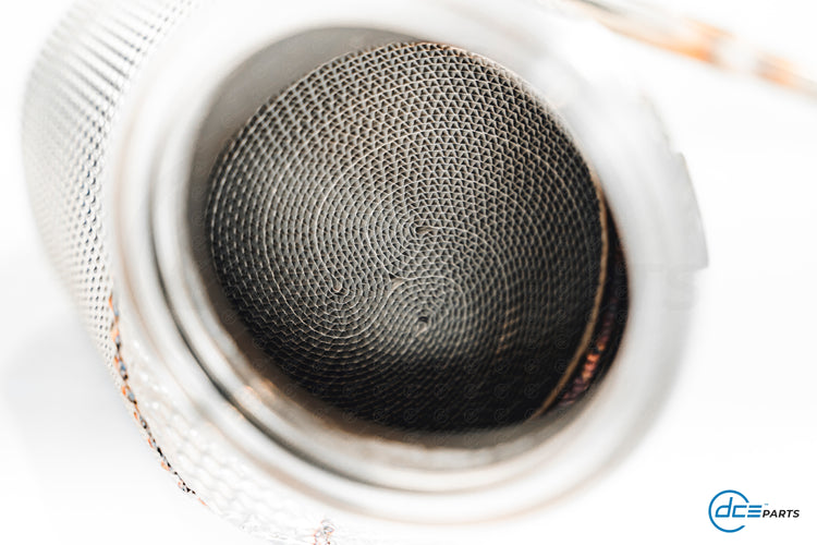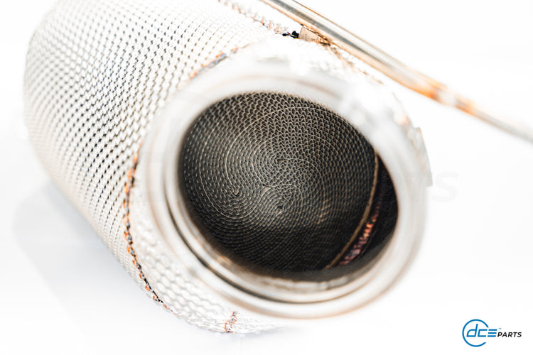 Most DCE Parts Downpipes can be specced with a full straight Decat, a Catalytic Converter Look (but with empty cat) or with a High Flow Cat.