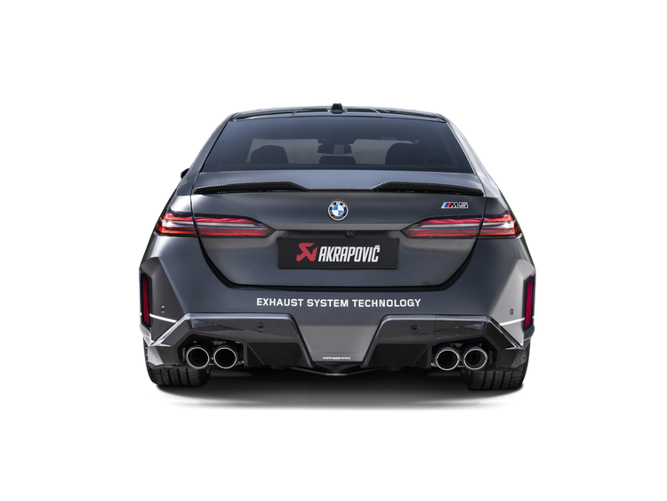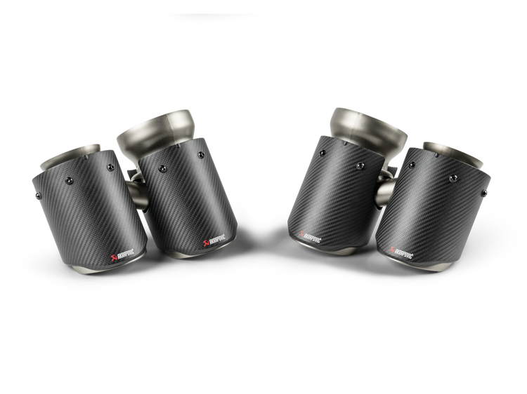 This set is constructed from race-proven materials, such as lightweight titanium, and it features a hand-made carbon-fibre outer sleeve. It has a classic cylindrical design, similar to the cylindrical tailpipes of the Akrapovič exhausts for various BMW M models, with a fresh new look for the BMW M5. The tailpipes come with integrated acoustic reflectors, which reflect part of the external sound toward the cabin and enhance the overall acoustic experience of an Akrapovič exhaust system.