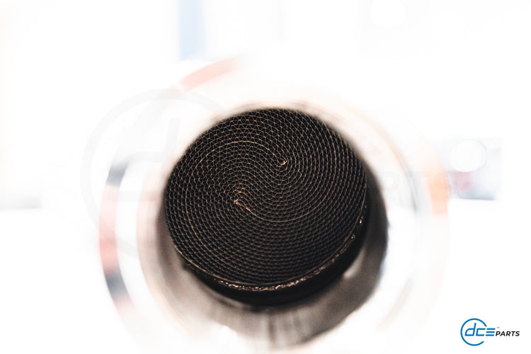Most DCE Parts Downpipes can be specced with a full straight Decat, a Catalytic Converter Look (but with empty cat) or with a High Flow Cat.