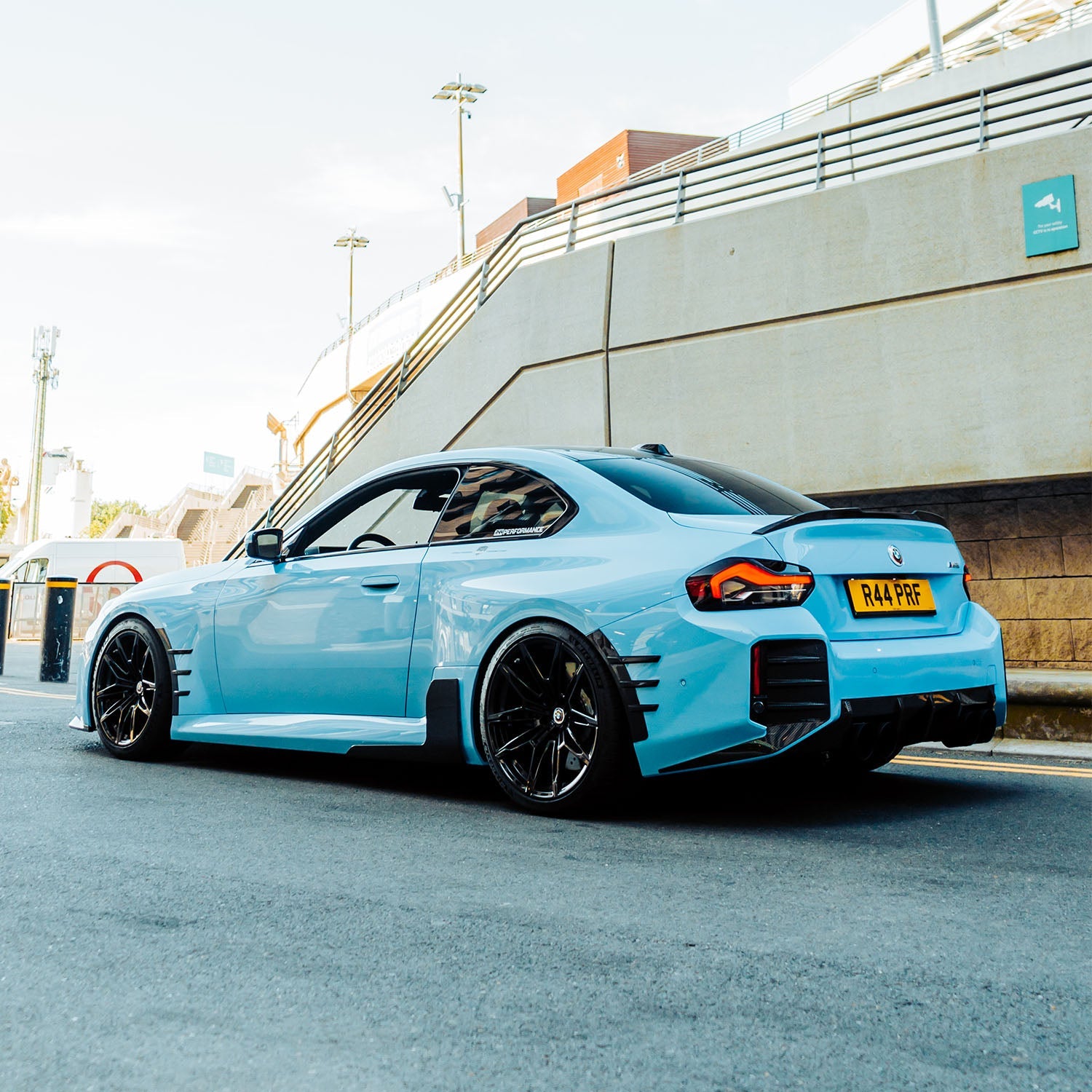 MHC+ carbon fibre performance style rear bumper inserts for the 2023+ BMW G87 M2 add a more aggressive OEM+ look to the G87 M2's rear end. These rear bumper inserts help to break up the rear of the car and really improve the G87 from this angle.