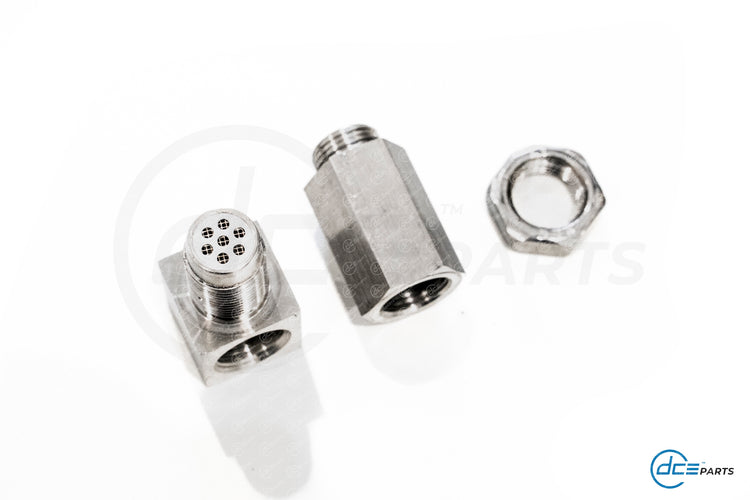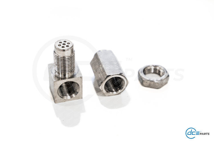 This lambda sensor is a 3 piece lambda O2 extension with a 90 degree adapter and a strainer and helps to solve this problem by taking the sensor out of the direct gas flow, thus fooling it into thinking that gas levels are not increased.