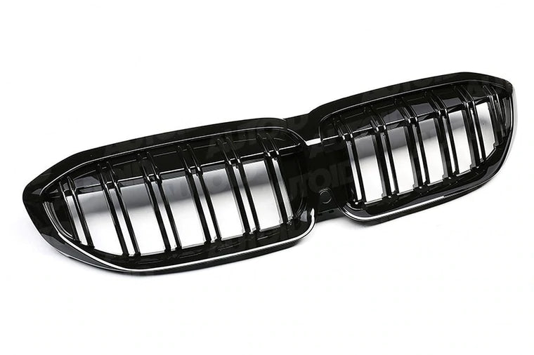 The PSR Parts Gloss Black Double Slat Kidney Grille is a direct replacement for the stock chrome kidney grille on the front bumper.