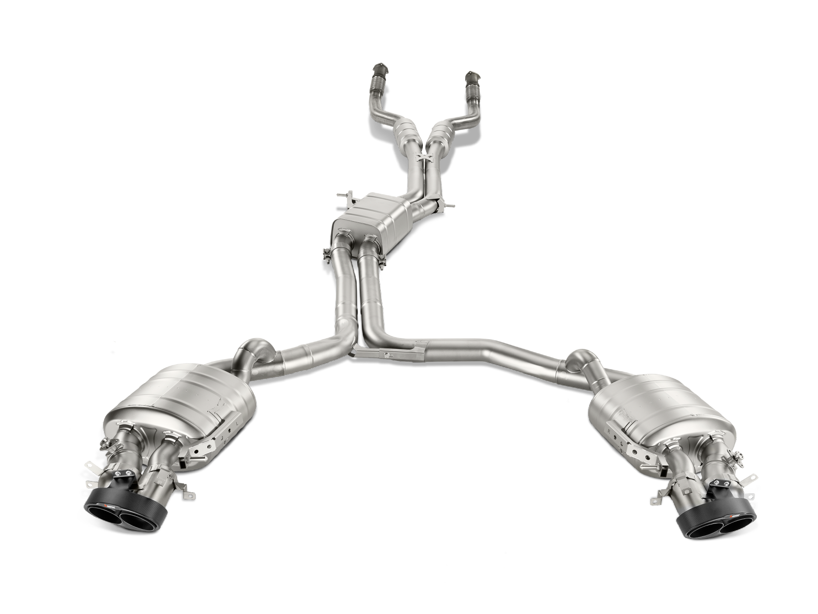 Audi’s high-performance RS models are an ideal match for the expertly styled and beautifully engineered Akrapovič Evolution exhaust systems.The Evolution gives more power, higher torque, decreases the weight, and delivers an unmistakable Akrapovič sound—which has a deep sound at lower revs and a ‘popping’ sound as things speed up when the throttle is lifted.This titanium exhaust system has cast collectors and three mufflers, with the central one featuring an x-piece inside, which increase power and improve its sound. The valves of the system are designed to open and close in line with the RS’ standard electronics, and the whole system has carbon-fibre tailpipes to show off the exquisite finish of the Akrapovič exhaust.Its easy-to-fit instructions are included, and with this cat-back performance exhaust system—which means that the stock catalytic converters remain in place—there’s no need to remap the ECU (it’s simply a plug-and play system).