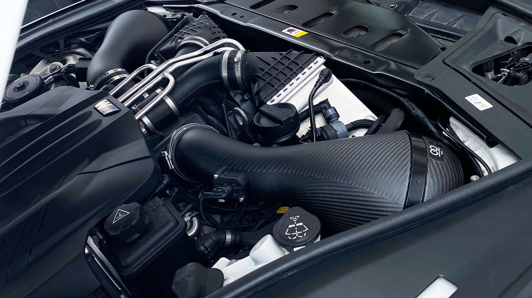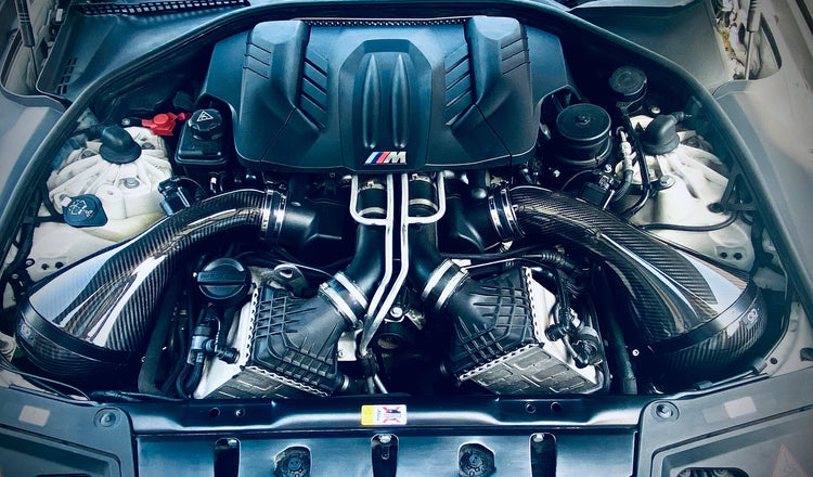 This fully developed and intelligently designed intake system is not just something that looks good in the engine bay but does an impeccible job as an air smoothing device, increasing air available, increasing air speed into the turbo's, allowing the turbo's to spool faster, filters for longer more efficiently, keeps intake air temperatures low and making a sophisticated bellowing V8 intake noise under load. Most important of all, it is the way the engine becomes more alive, responsive and enjoyable to use not just under full load but also normal every day driving.