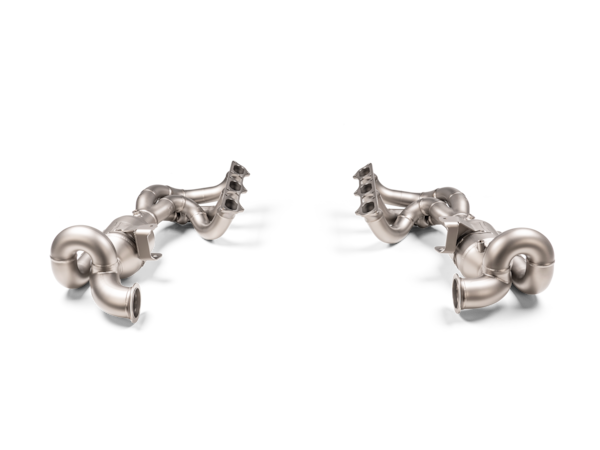 Evolution Header Set (Titanium) was tested and developed together with Slip-On Race Line (Titanium) system.This product is made using high-grade titanium, with the parts sandblasted and coated for durability. This new header set has a routing that has been designed to perfectly direct the gas flow. Showcasing the special manifold crossover pipes in the headers, cast in the Akrapovič in-house titanium foundry, this innovative design comes directly from race-proven exhaust systems, and this is the first time it has featured in an Akrapovič aftermarket car exhaust. This masterpiece of engineering is designed solely to optimize the performance of the Slip-On Race Line (Titanium) in the midrange. Many parts in the headers are cast in the in-house foundry, and the complete use of titanium results in a weight saving of 3.8 kg, which is 28% lighter than the stock equivalent. Tuned quarter-length resonators in addition to the catalytic converters ensure the sound quality and the absence of any distortion or unwanted frequencies, creating a unique sound experience. The combination of an Akrapovič Slip-On Race Line (Titanium) and Evolution Header Set (Titanium), developed for use on closed-course competition circuits only, provides increases of 16.6 kW (22.6 hp) in power at 4,550 rpm and 35.2 Nm in torque at 4,500 rpm, when tested on the Akrapovič dyno against a Porsche 911 GT3 (992) with a standard stock exhaust.When installing the Akrapovič Evolution Header Set (Titanium) on vehicles with particulate filters, remapping the ECU is mandatory to prevent potential “check engine light” warning signals. When installing the Akrapovič Evolution Header Set (Titanium) on vehicles without particulate filters, remapping the ECU is recommended.This system fits also on vehicles equipped with Otto particulate filter (OPF).This product does not fit on RS version.THIS PRODUCT DOES NOT MEET EMISSION COMPLIANCE REQUIREMENTS FOR STREET OR HIGHWAY USE.