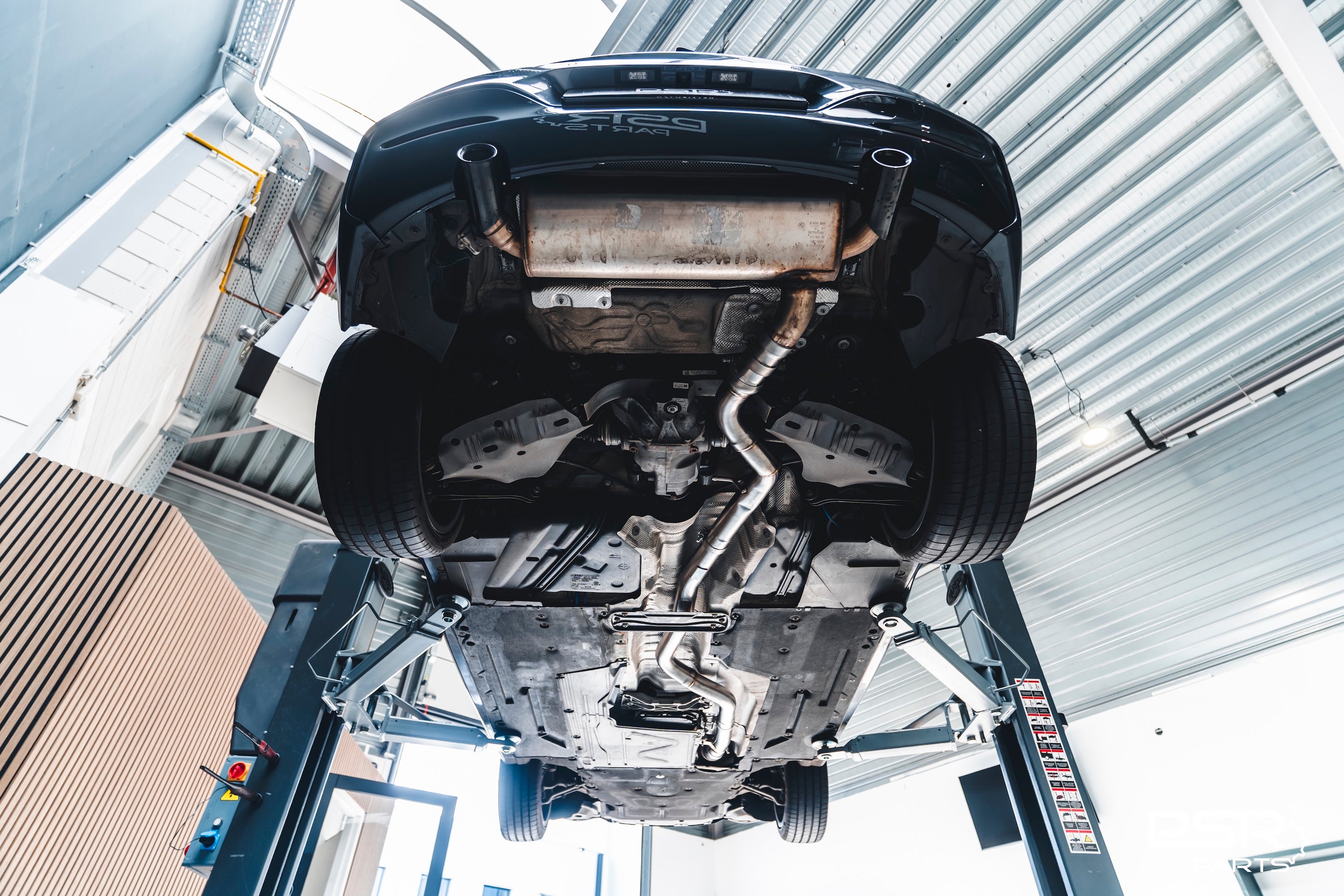 The high flow midpipe's back pressure is significantly reduced and results in a better performance and quicker throttle response due to the turbos spooling faster.