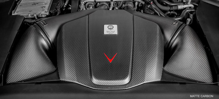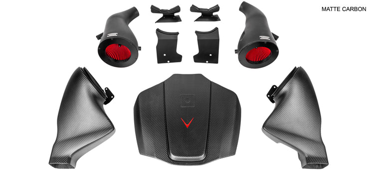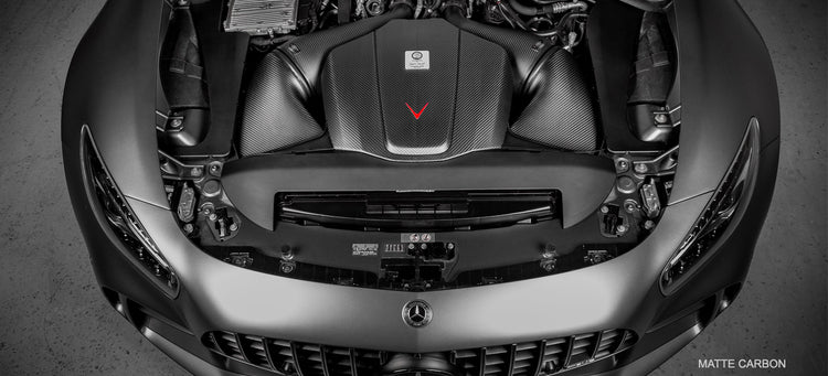 The AMG GTR Eventuri intake is a fully sealed system which was developed through extensive real world testing and airflow simulation analysis. It features our patented Venturi housings which allow for the smoothest possible airflow to the turbo inlets. The housings encase our bespoke filters which help to shape the airflow and maintain laminar conditions. They have also been maximised in internal volume to reduce restrictions and in doing so we have also redesigned the OEM central cover as it fouls on the significantly larger system. Finally, intake air temperatures are kept steady with the ducts which seal to the filter housings. The AMG GTR intake system has been independently tested by World leading Mercedes tuning company – RENNtech and has been proven to give improved performance in both stock and tuned engines. Each system comes complete with the carbon central cover.