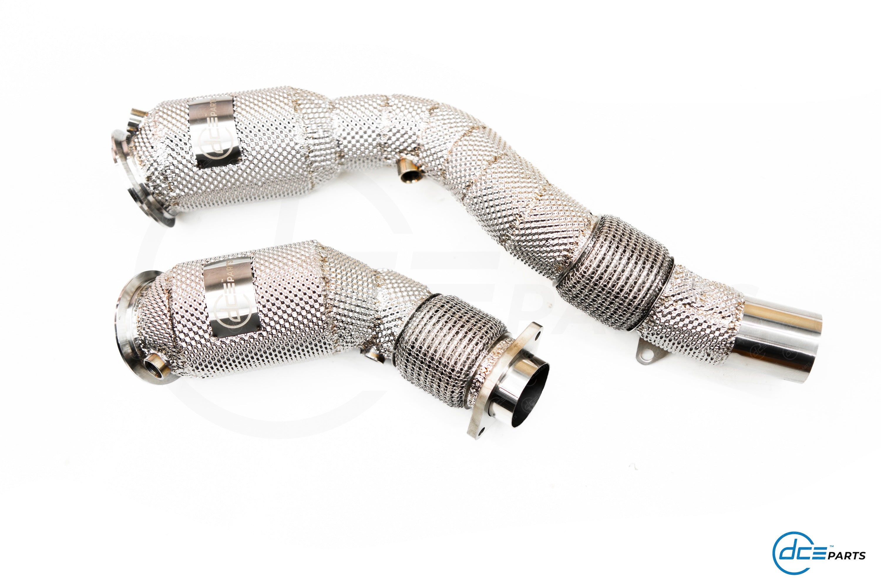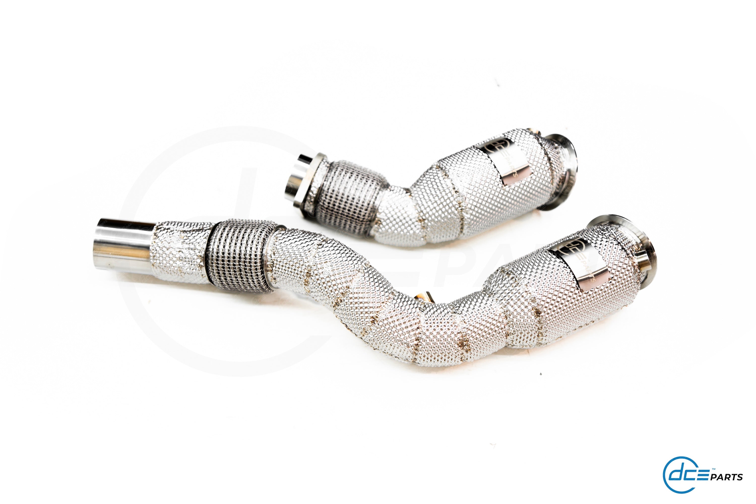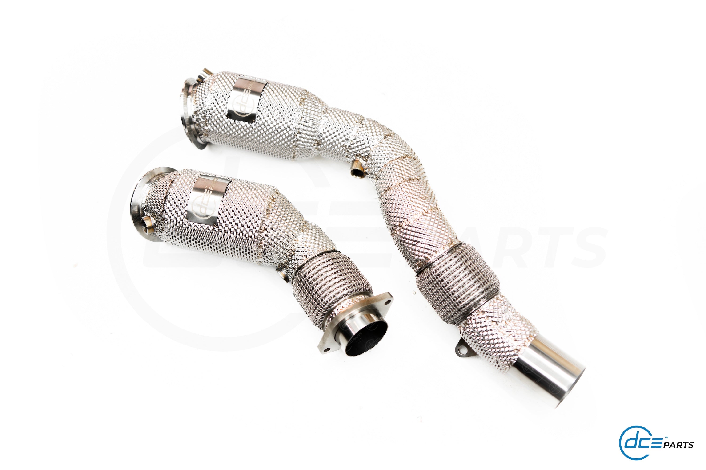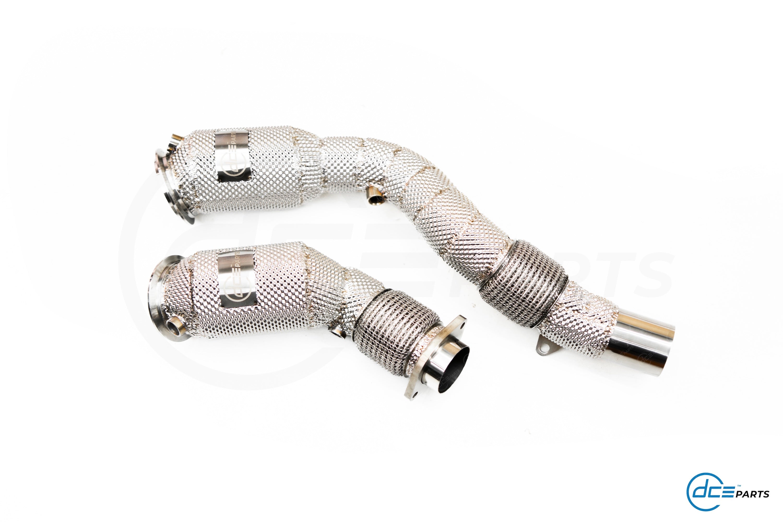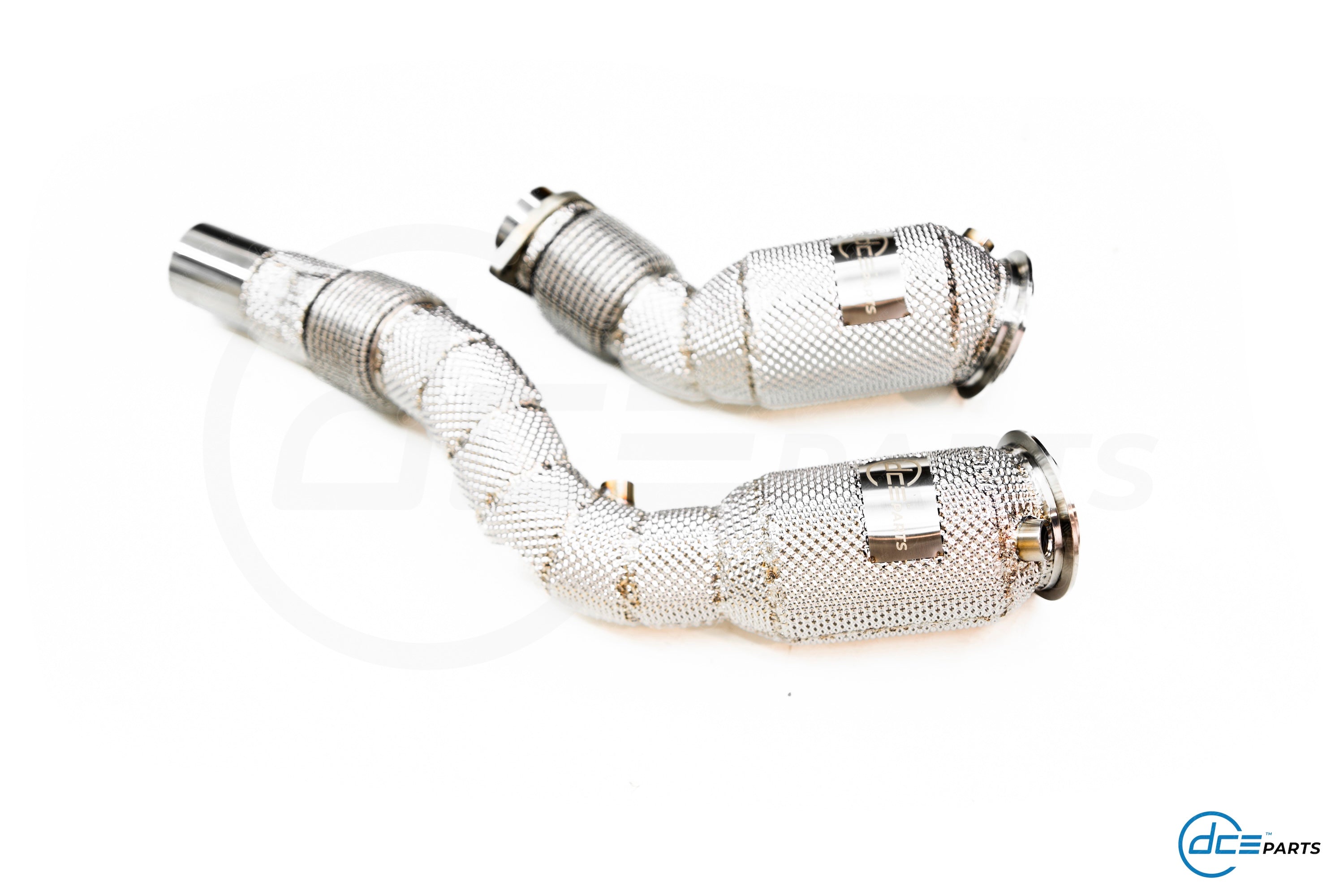 Most DCE Parts Downpipes can be specced with a full straight Decat, a Catalytic Converter Look (but with empty cat) or with a High Flow Cat.