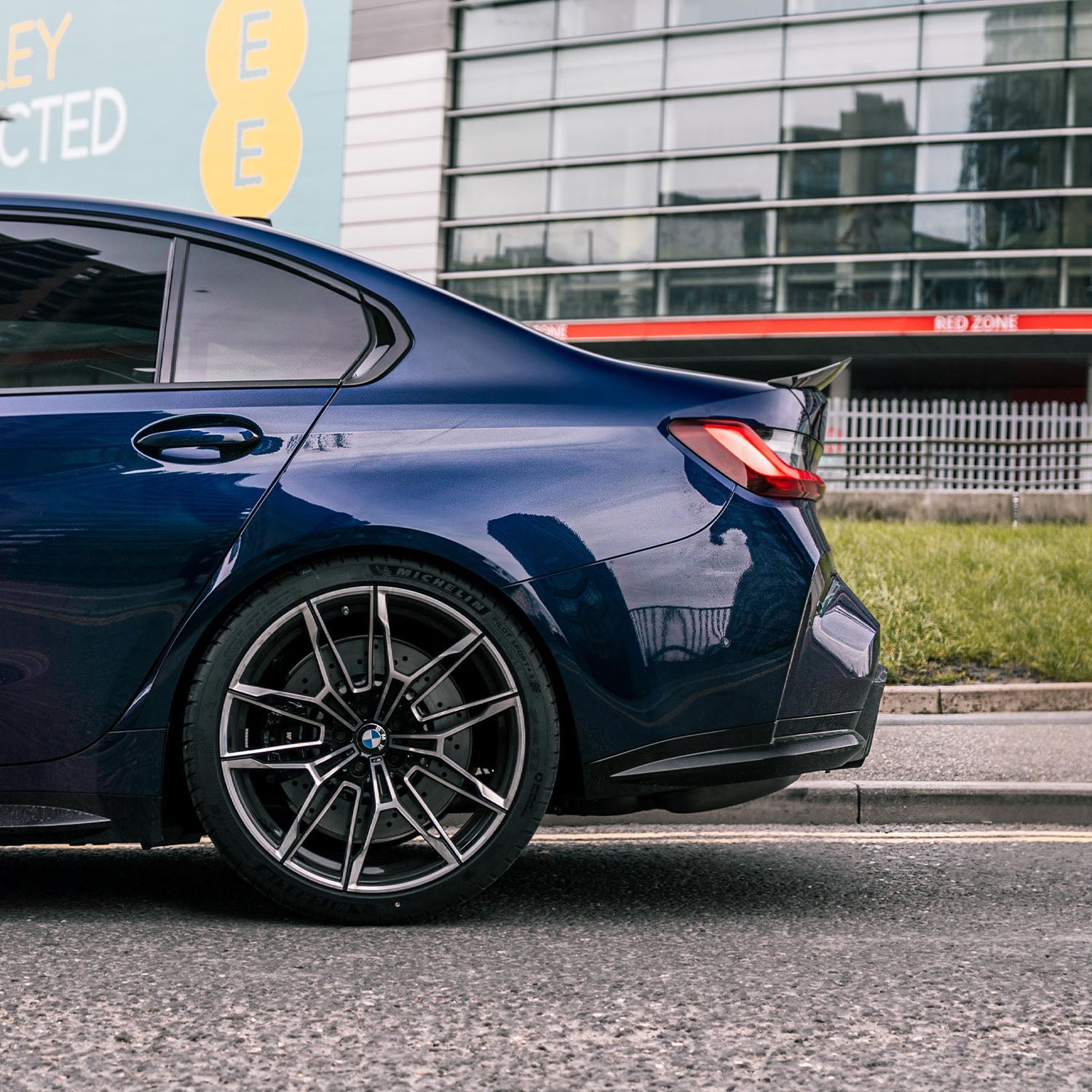 MHC+ BMW G80 M3 Ducktail Style Rear Spoiler In Pre-Preg Carbon Fibre is a very aggressive rear spoiler design extending outwards the furthest out of all the MHC+ lip spoilers. The product features a central dip that accentuates two sharp fins for added aggression.