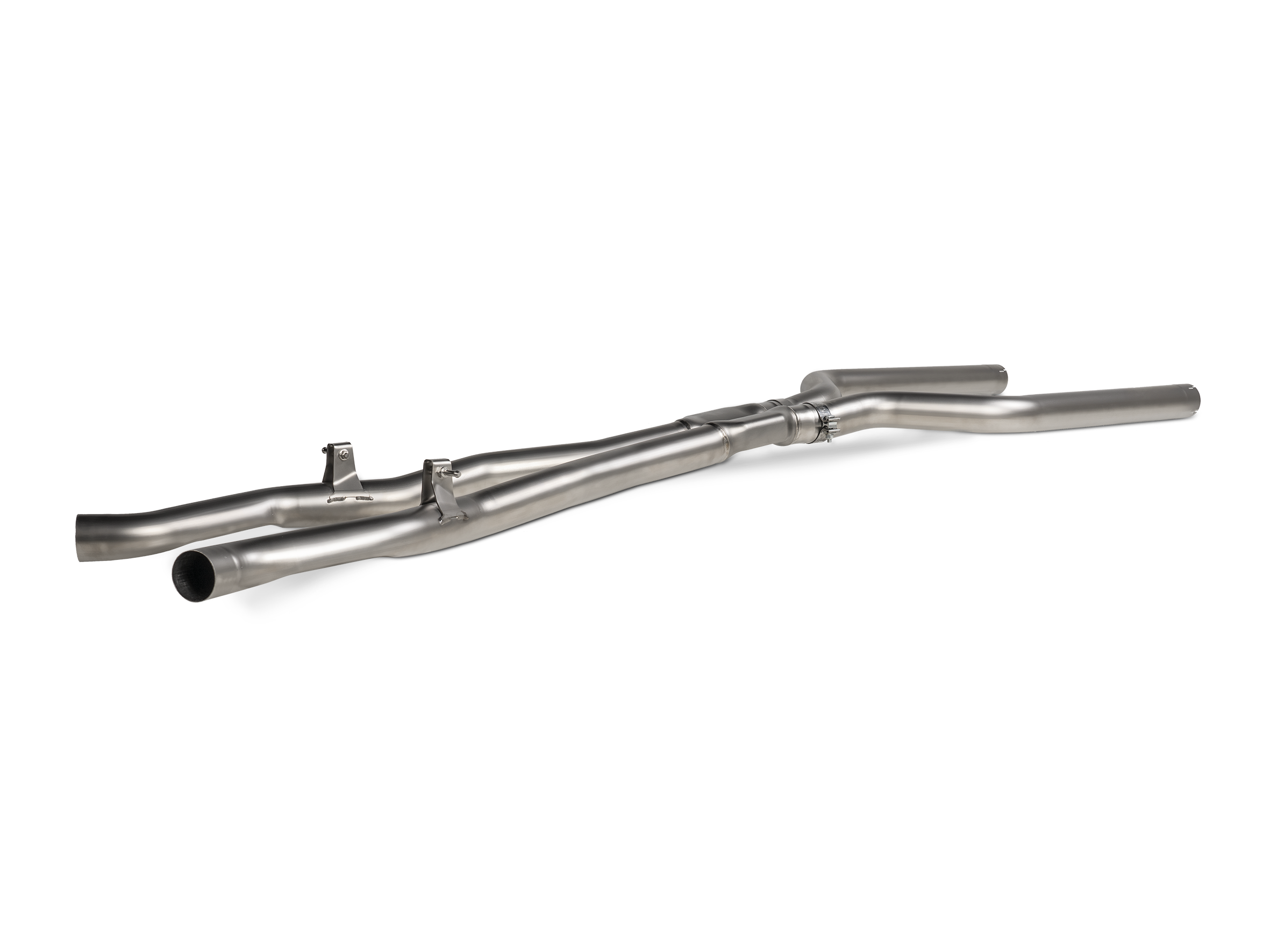 Evolution Link Pipe Set (Titanium) was tested and developed together with Slip-On Line (Titanium).This full titanium accessory features complex parts cast in Akrapovič’s in-house foundry and is constructed from lightweight high-grade alloys to reduce weight. Combining the Evolution Link pipe set (Titanium) with the Slip-On Line (Titanium) exhaust creates a system that is perfectly in tune to deliver the very best aural experience in all driving modes. Akrapovič’s sound engineers have worked hard to produce a sporty V8 sound with an unmistakable Akrapovič character, while keeping it smooth and eliminating any drone, all designed for maximum everyday comfort. The sound is closer to that of a muscle car and delivers an exhilarating soundtrack. With a cast collector on the link pipe, where the gases from both sides of the engine mix, the link pipe provides a smooth flow for the gas and aids in providing the perfect sound as an ideal upgrade for the Slip-On Line (Titanium). With the installation of this optional accessory, ECE type approval for the Slip-On Line (Titanium) exhaust system is not valid, and remapping the ECU is mandatory when it is fitted.When installing the Akrapovič Evolution link pipe set, remapping the ECU is mandatory in order to prevent potential “check engine light” warning signals.Fitment notice: This optional link pipe does not fit on OPF equipped vehicles with emission product code S1DFA.THIS PRODUCT DOES NOT MEET EMISSION COMPLIANCE REQUIREMENTS FOR STREET OR HIGHWAY USE.